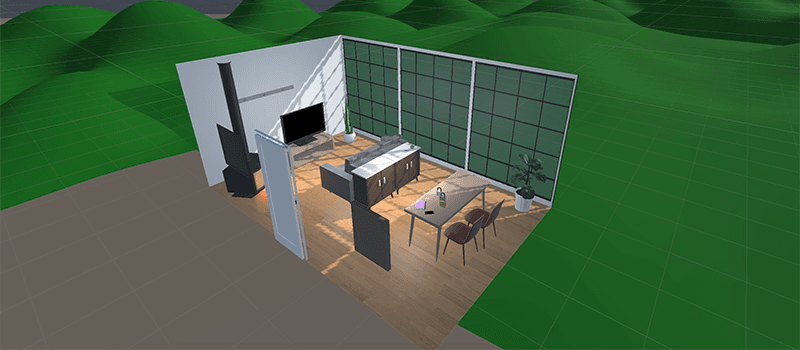 Om een snel test-project te hebben maakte ik eerder gebruik van enkele assets van een project op de website van Unity zelf. Dit was het eerste resultaat in mijn VR-headset: