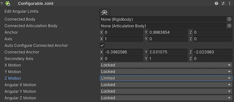 Bij een Configurable Joint kan je instellen in welke richting je object in kwestie kan bewegen. Afhankelijk van de richting waarin je kast staat, kan je alle 'Motions' op locked zetten, behalve de richting dat je lades moeten kunnen bewegen.