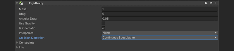 Zorg ervoor dat de 'Mass' van deze Rigidbody op een nummer van 8 tot 12 staat, de 'Drag' op 0, en de 'Angular Drag' op 0.05.