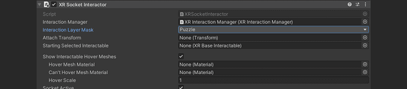 Zet nu de Layer van ieder puzzelstuk op 'Puzzle', en in de XR Socket Interactor component die je juist hebt aangemaakt, zet je de Interaction Layer Mask op 'Puzzle'.