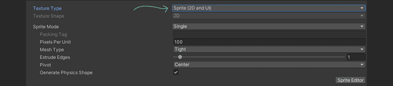 Maak dan van je PNG-afbeelding van je puzzelstuk een Sprite via Texture Type → Sprite (2D and UI) door je afbeelding aan te klikken. Dan zal je die optie zien staan.