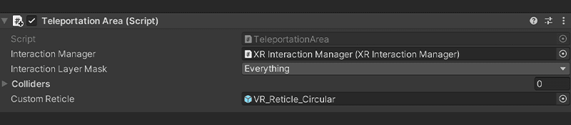 Selecteer je vloer, en voeg de nieuwe component Teleportation Area toe via Add Component → Teleportation Area.